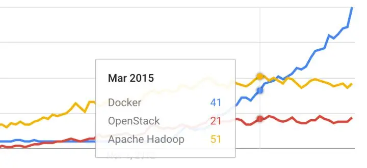 现在以 Docker 为代表的容器技术来了,而且关注度越来越高,这一点可以从 Google Trend 中 Docker 的搜索上升趋势(蓝色曲线)中清楚看到。