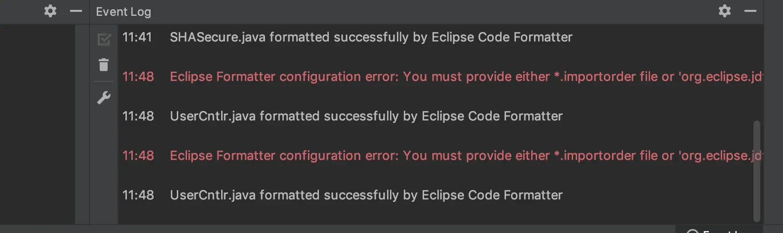 虽然实现了自动化格式代码但是出现了Eclipse Formatter configuration error: You must provide either *.importorder file or 'org.eclipse.jdt.ui.prefs' file, see instructions.错误,反正我是忍不了这种红色的提示,查阅资料后解决: