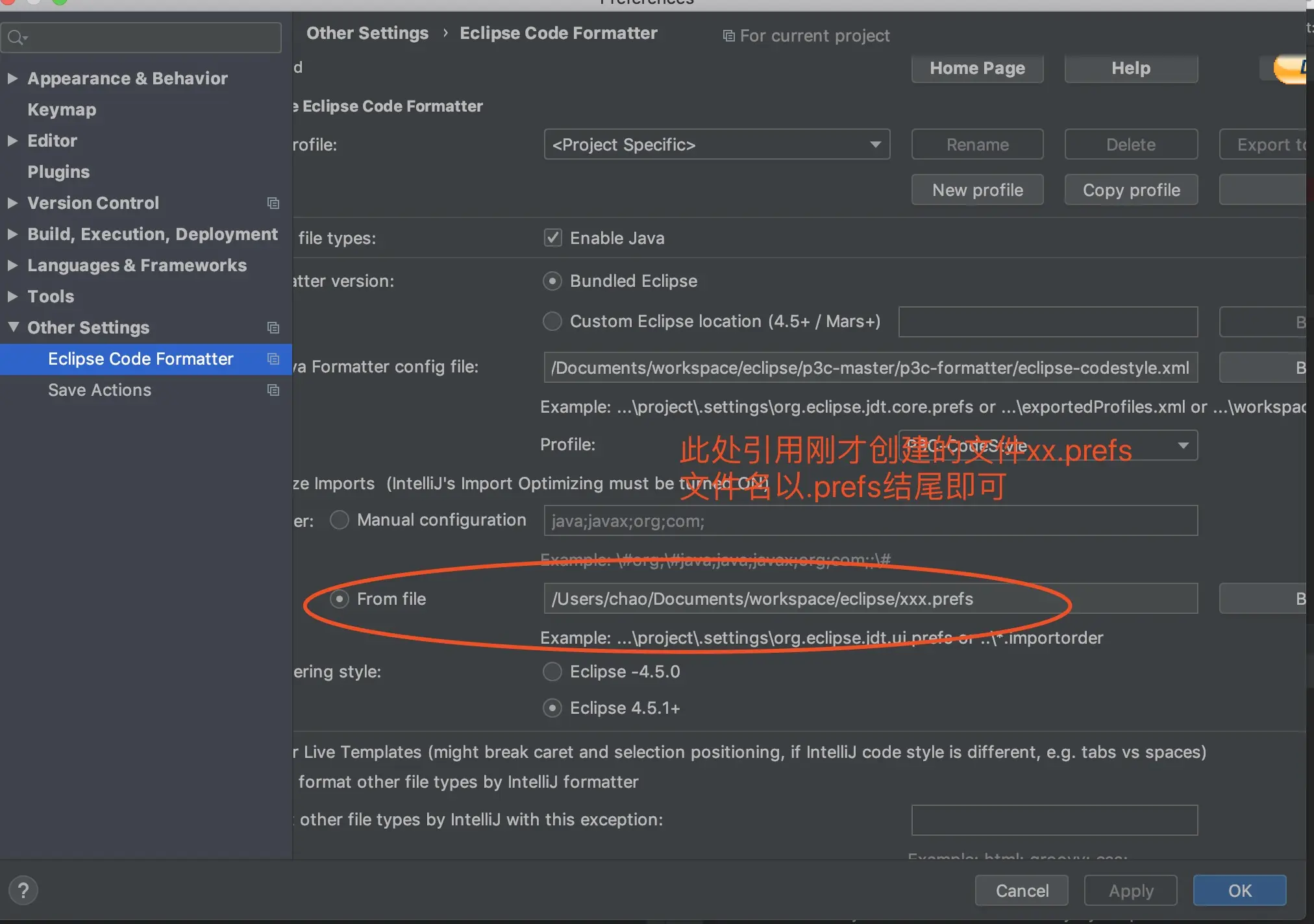 - 配置 Eclipse Code Formatter(图中的文件路径即为下载的配置文件,在该文件目录下p3c-formatter/eclipse-codestyle.xml)