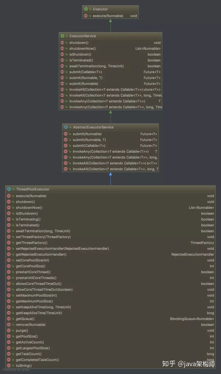 然后再下来一层是 AbstractExecutorService,从名字我们就知道,这是抽象类,这里实现了非常有用的一些方法供子类直接使用,之后我们再细说。