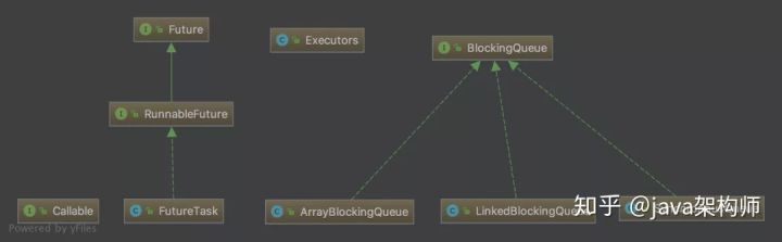 }另外,由于线程池支持获取线程执行的结果,所以,引入了 Future 接口,RunnableFuture 继承自此接口,然后我们最需要关心的就是它的实现类 FutureTask。到这里,记住这个概念,在线程池的使用过程中,我们是往线程池提交任务(task),使用过线程池的都知道,我们提交的每个任务是实现了 Runnable 接口的,其实就是先将 Runnable 的任务包装成 FutureTask,然后再提交到线程池。这样,读者才能比较容易记住 FutureTask 这个类名:它首先是一个任务(Task),然后具有 Future 接口的语义,即可以在将来(Future)得到执行的结果。