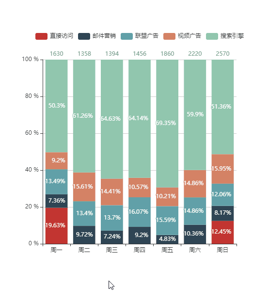 之前群里的小伙伴他们公司的一个需求, Y轴显示百分比, 每条柱子上都有总数