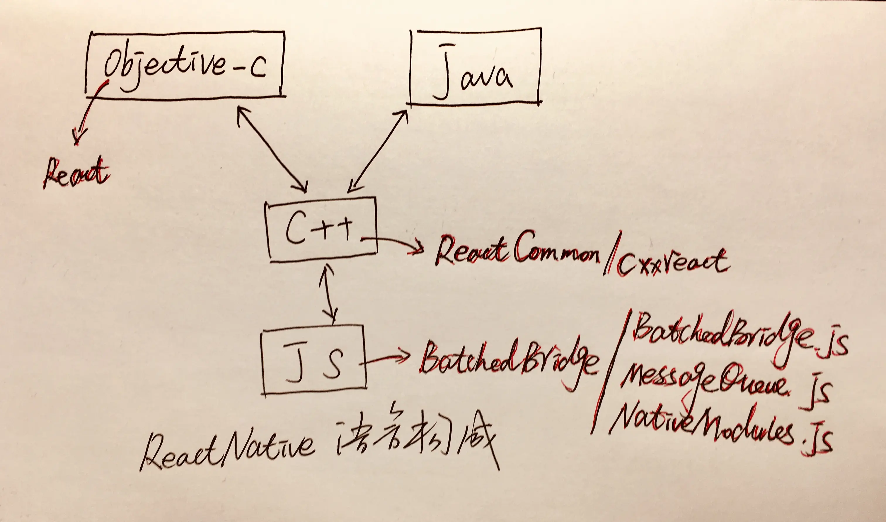 RCTBridge与RCTCxxBridge属于 iOS 平台特有,前者是 RN 对业务层接口(图中其他类都属于内部类,业务层无感知),具体工作在其子类RCTCxxBridge中完成;- 整个 RN 的核心在跨平台的 C++层,其中很多类的功能从其名称即可略知一二,后文也会有详细的描述;