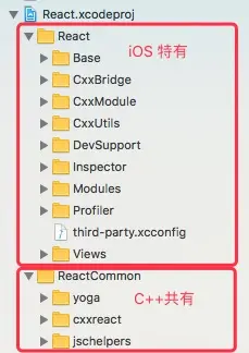 C++与JS部分的实现为多平台共用,在此基础上再分化为各平台实现。其中,iOS 平台特有的实现(Objective-C、C++)主要集中在 React 下,以C++语言实现的共有部分在 ReactCommon 下: