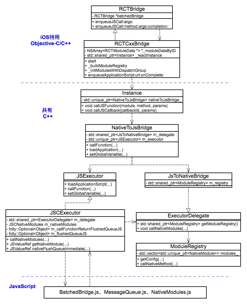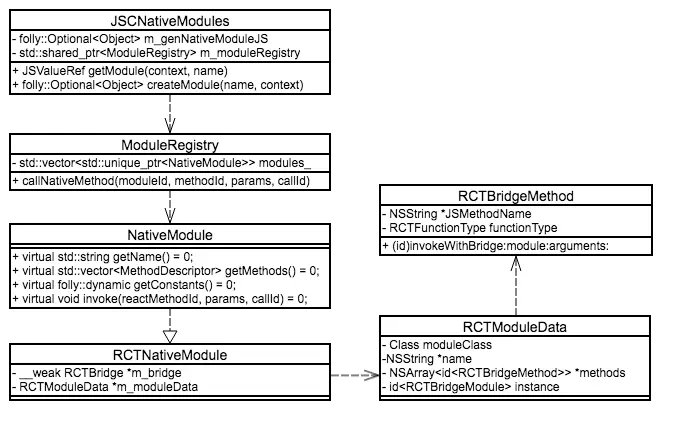 JSCNativeModules——C++类,在JSCExecutor中使用;ModuleRegistry——C++类,是NativeModule的集合;NativeModule——C++抽象类,定义了与 NativeModule 有关的接口;RCTNativeModule——实现了NativeModule中定义的接口;RCTModuleData——OC类,是存储曝露的moudle 的数据结构;RCTBridgeMethod——OC类,是存储曝露给 JS 接口(方法)的数据结构。