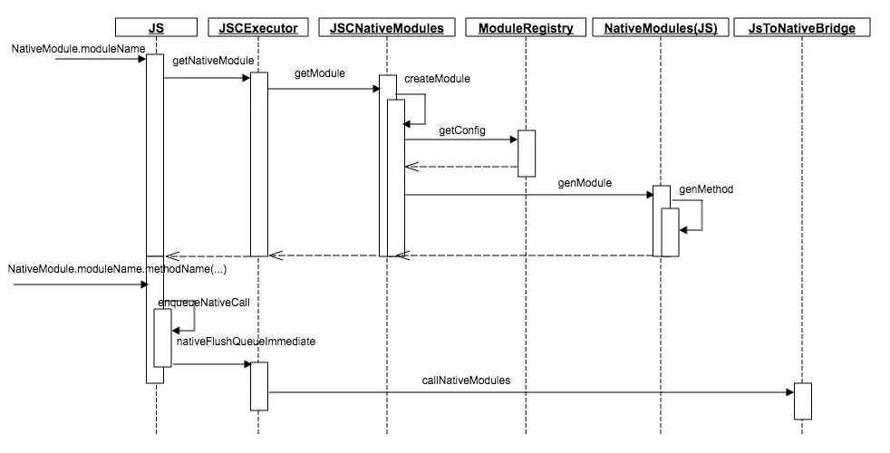 NativeModules.moduleName(JS)->JSCExecutor::getNativeModule->JSCNativeModules::getModule->JSCNativeModules::createModule->NativeModules. genModule(JS)