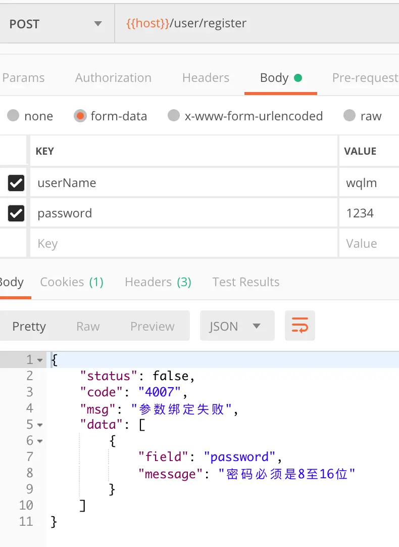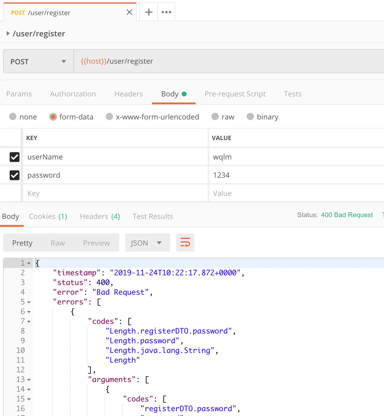通过 post 提交表单的方式访问 /register 接口,如果参数校验不通过会抛出 BindException 异常