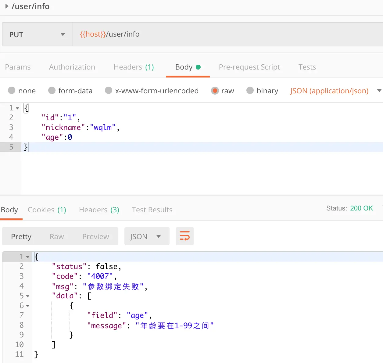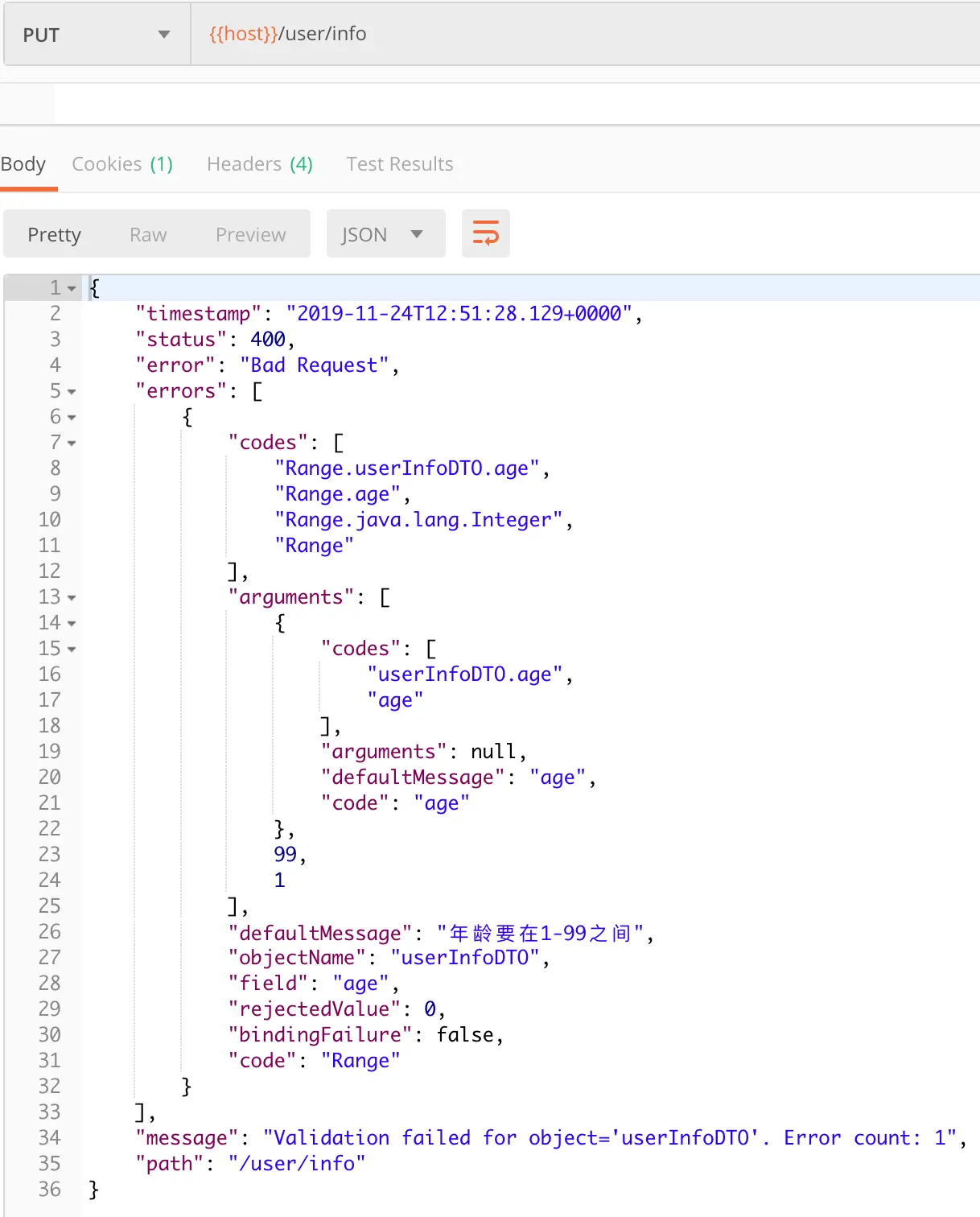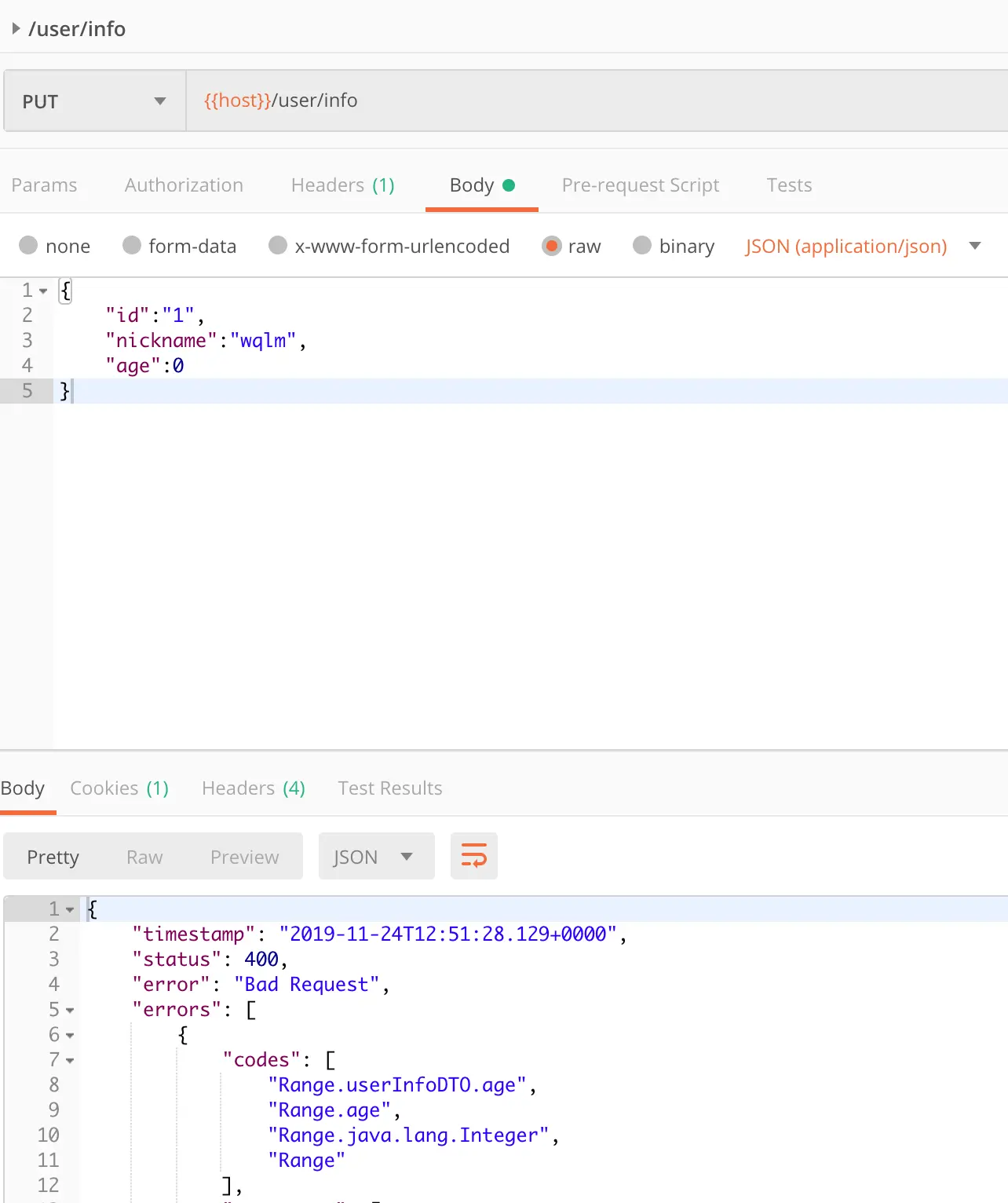 通过 put 提交 json 的方式访问 /info 接口,如果参数校验不通过会抛出 MethodArgumentNotValidException 异常