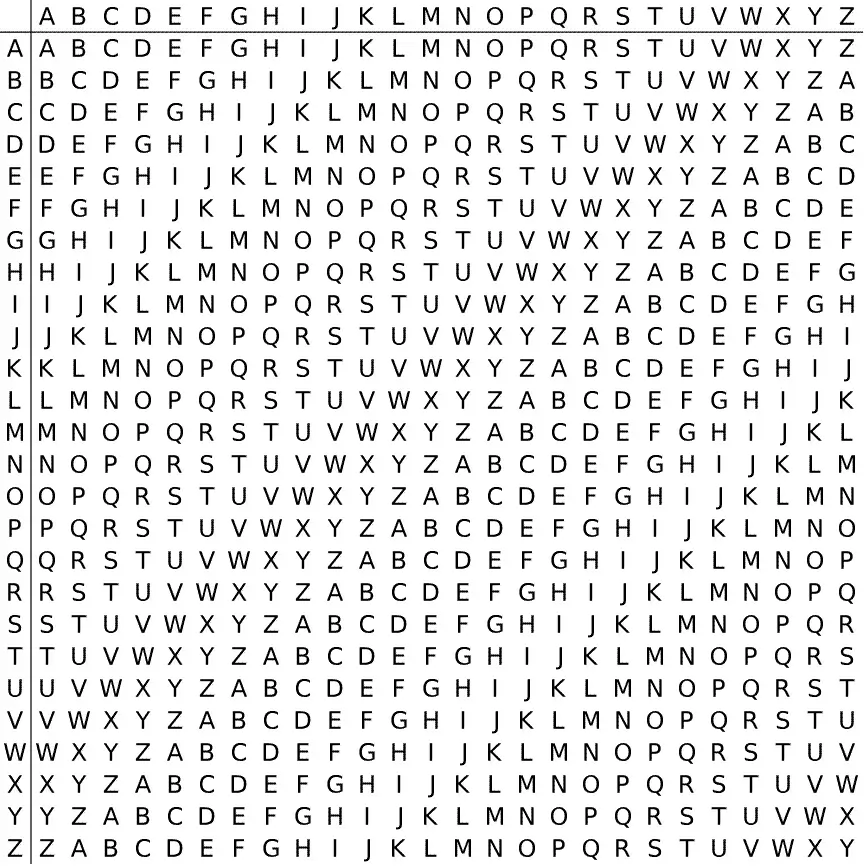 维吉尼亚密码是在凯撒密码基础上产生的一种加密方法,它将凯撒密码的全部25种位移排序为一张表,与原字母序列共同组成26行及26列的字母表。另外,维吉尼亚密码必须有一个密钥,这个密钥由字母组成,最少一个,最多可与明文字母数量相等。