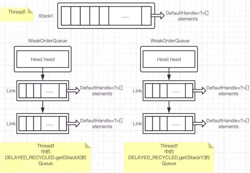 ThreadLocal<Map<Stack<?>, WeakOrderQueue>> delayedRecycled实例; 每一个线程对象包含一个 Map<Stack<?>, WeakOrderQueue>,存储着为其他线程创建的 WeakOrderQueue 对象,WeakOrderQueue 对象中存储一个以 Head 为首的 Link 数组,每个 Link 对象中存储一个 DefaultHandle[] 数组,用于存放回收对象。