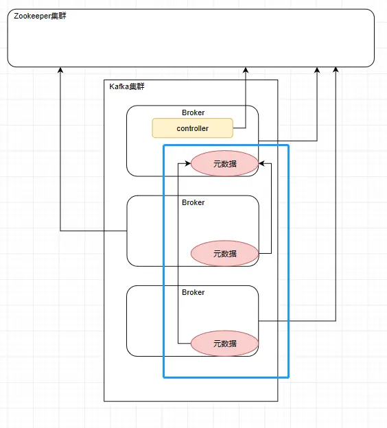 然后controller也会监听zookeeper集群的变化,在集群产生变化时更改自己的元数据信息。并且follower也会去它们的老大controller那里去同步元数据信息,所以一个Kafka集群中所有服务器上的元数据信息都是一致的。