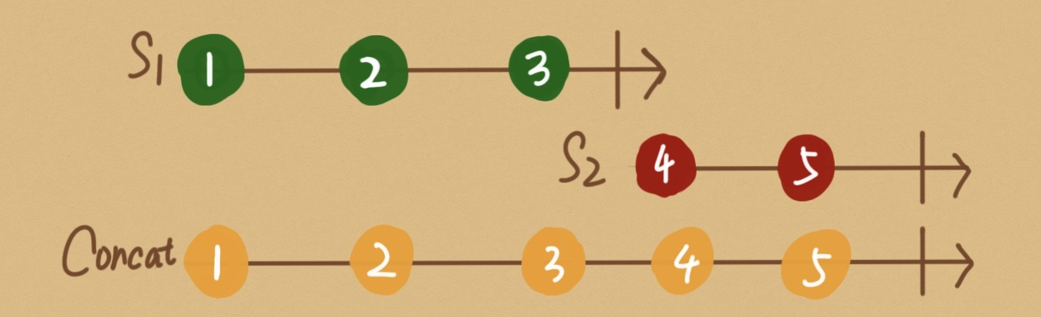 与concat类似,merger操作符也可将两个或多个数据流合并到一个数据流中,但不再是以首尾相连的形式,而是在第一时间订阅所有传入的Observable的值,任意一个Observable对象中的值发生变化,则立即传给下游的Observable对象。