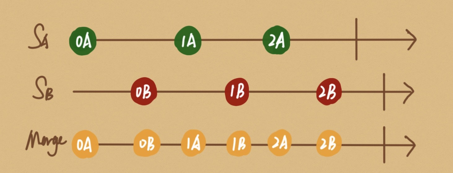 let sourceA = timer(0, 1000).pipe(map(x => x + 'A'), take(3)); let sourceB = timer(500, 1000).pipe(map(x => x + 'B'), take(3)); merge(sourceA, sourceB).subscribe( v => console.log(v), err => console.log(err), () => console.log('complete') ) // Result: // 0A // 0B // 1A // 1B // 2A // 2B // complete弹珠图:
