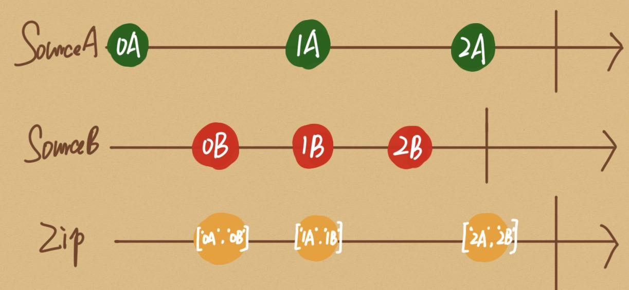 let sourceA = timer(0, 1000).pipe(map(x => x + 'A'), take(3)); let sourceB = timer(500, 500).pipe(map(x => x + 'B'), take(3)); zip(sourceA, sourceB).subscribe( v => console.log(v), err => console.log(err), () => console.log('complete') ) // Result: // ["0A", "0B"] // ["1A", "1B"] // ["2A", "2B"] // complete弹珠图: