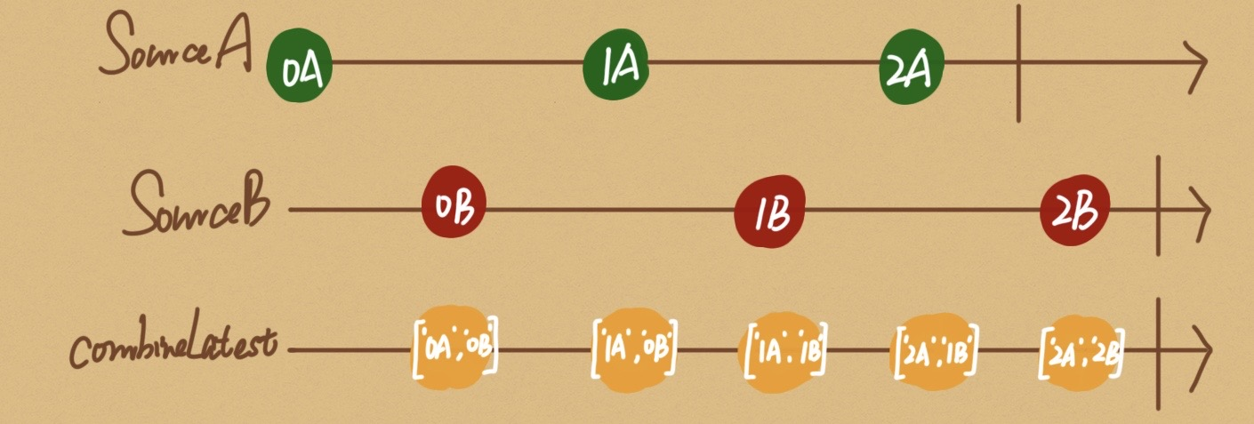 combineLatest组合先后创建的两个异步数据流: let sourceA = timer(0, 1000).pipe(map(x => x + 'A'), take(3)); let sourceB = timer(500, 1000).pipe(map(x => x + 'B'), take(3)); combineLatest(sourceA, sourceB).subscribe( v => console.log(v), err => console.log(err), () => console.log('complete') )