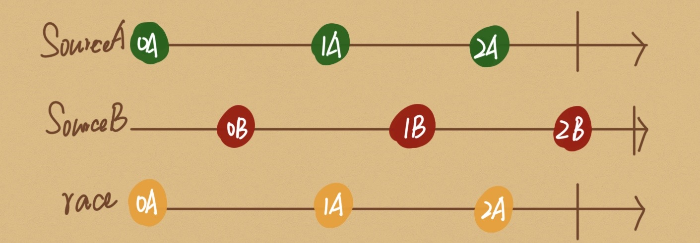 race作为单词表示为竞争,赛跑等意思,在Rxjs中,也是表示竞争。当多个Observable对象作为输入,谁先产生数据,则将谁传递到下游的Observable对象中,其余的输入则都可以看作陪跑,会被退订且忽略。
