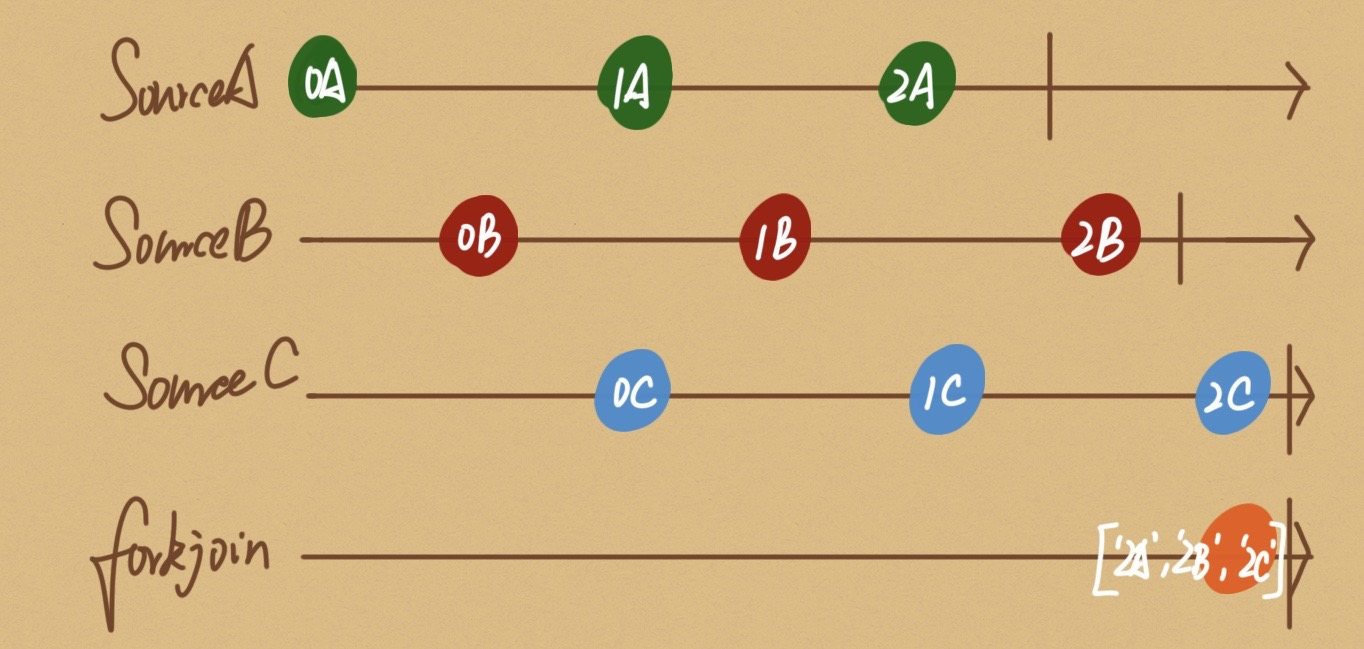 forkjoin同样接受多个Observable作为输入,与上述几个操作符都不同,forkjoin最终只产生一个数据,只有所有的输入都完成,不再有新数据产生时,forkjoin才会将所有输入Observable对象的最后一个数据组合到一个数组中,发给最终的Observable。