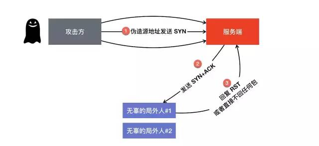 答案:攻击方伪造源地址发送SYN报文,服务端此时回复syn+ack,但是真正的IP地址收到这个包之后,有可能直接回复了RST包,但是如果不回复RST包,那就更严重了,可能服务端会在几十秒后才关闭这个socket链接(时间根据每个系统不一样)