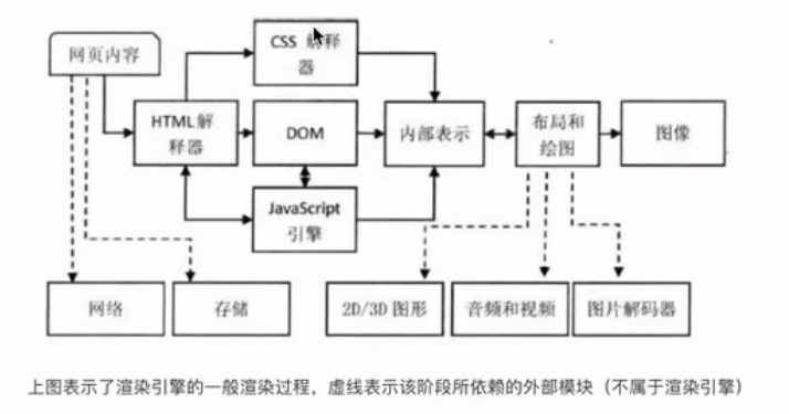 JAVASCRIPT引擎: 遇到js代码时,需要使用javascript解释器,并使得js代码有调用DOM接口和CSSOM接口的能力.