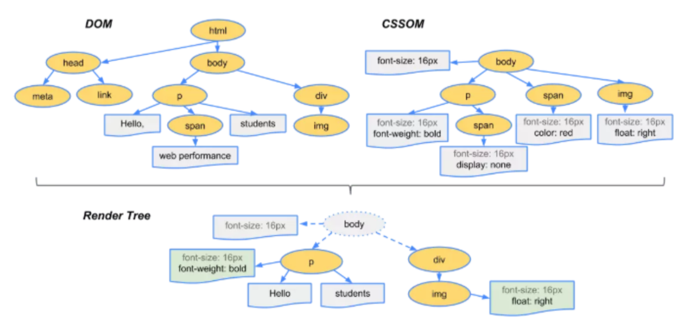 DOM树+CSSOM(成层叠样式表模型 = 合并成渲染树(rendering Tree)