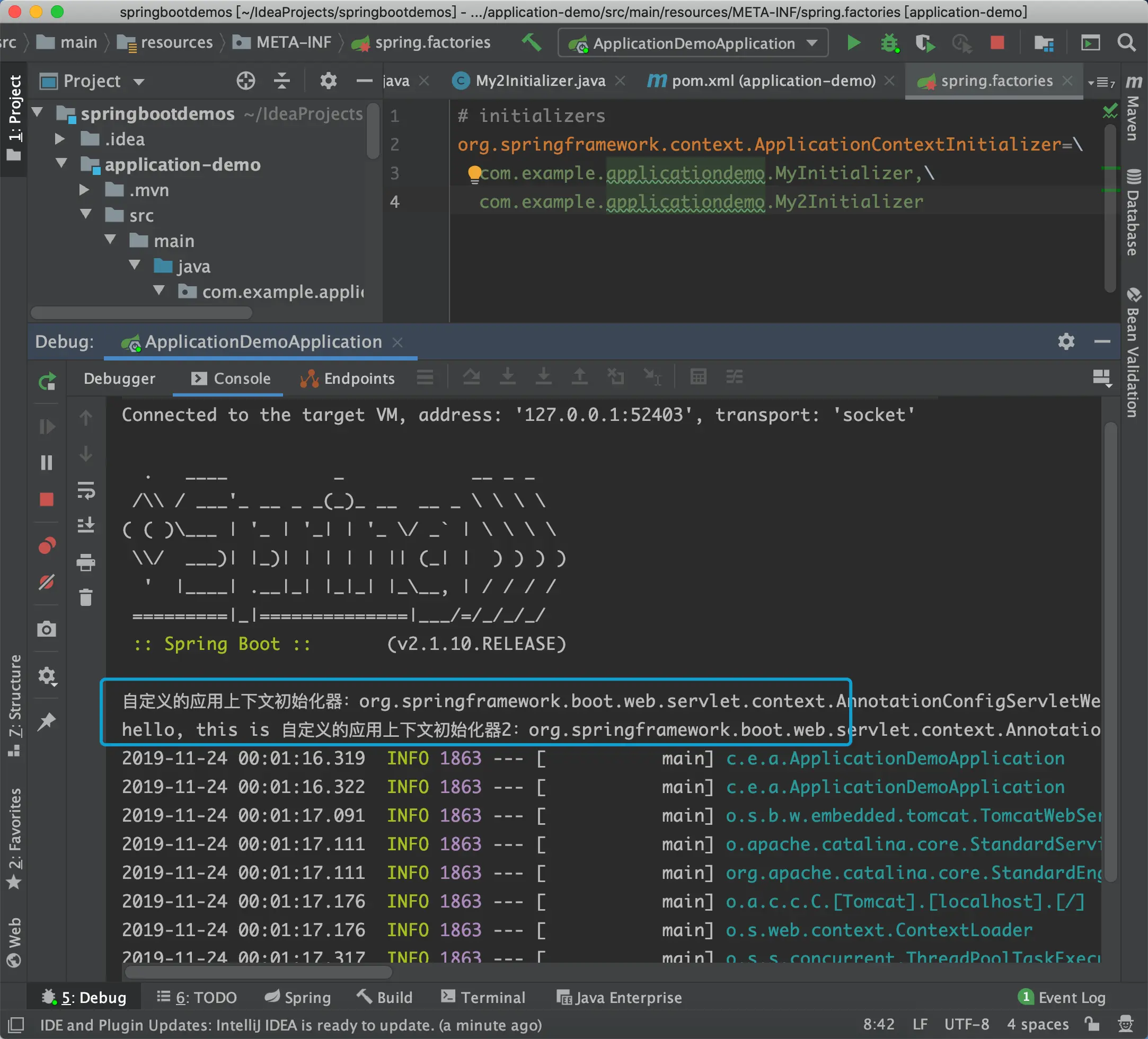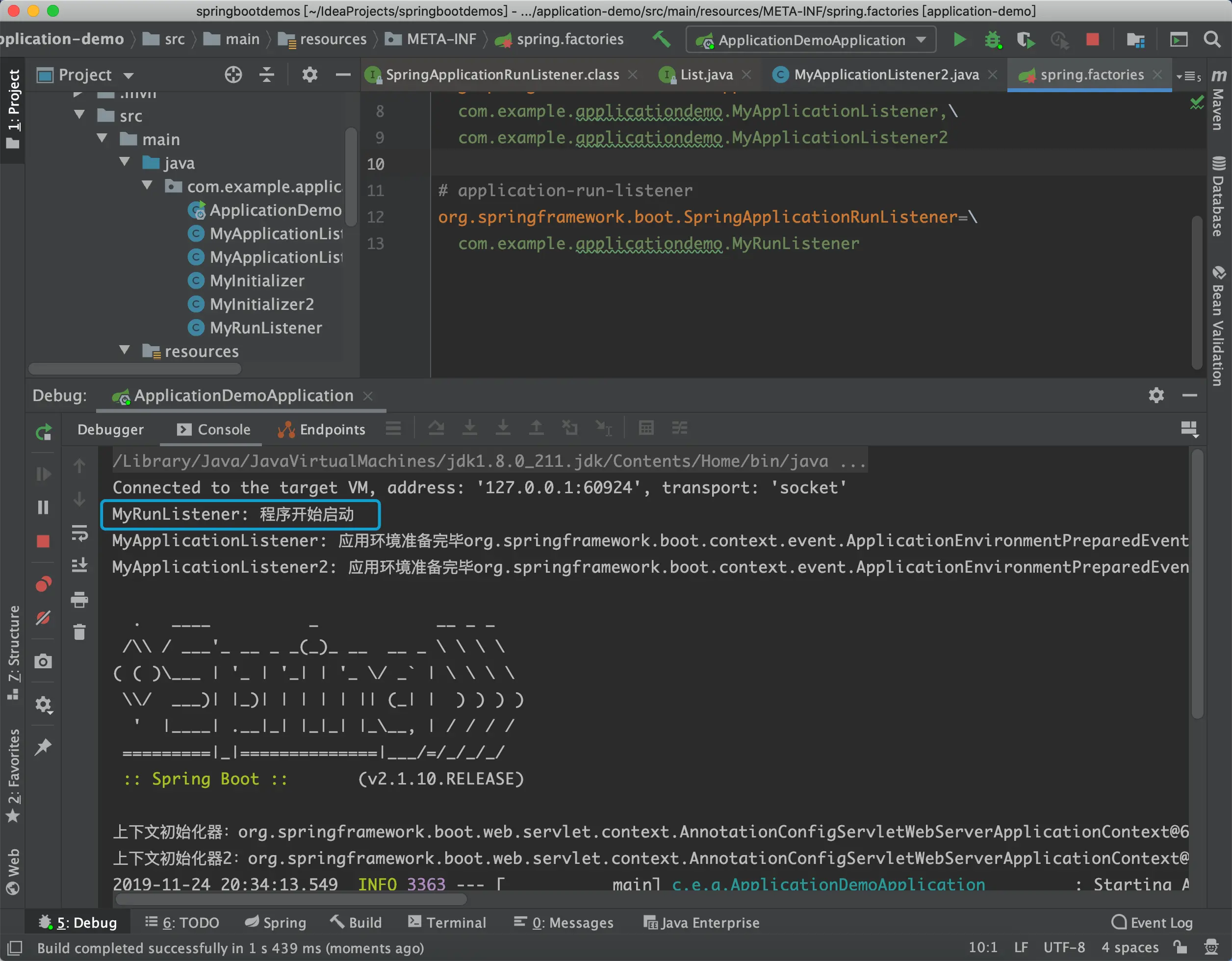 在spring.factories中加入applicationListener的配置:
