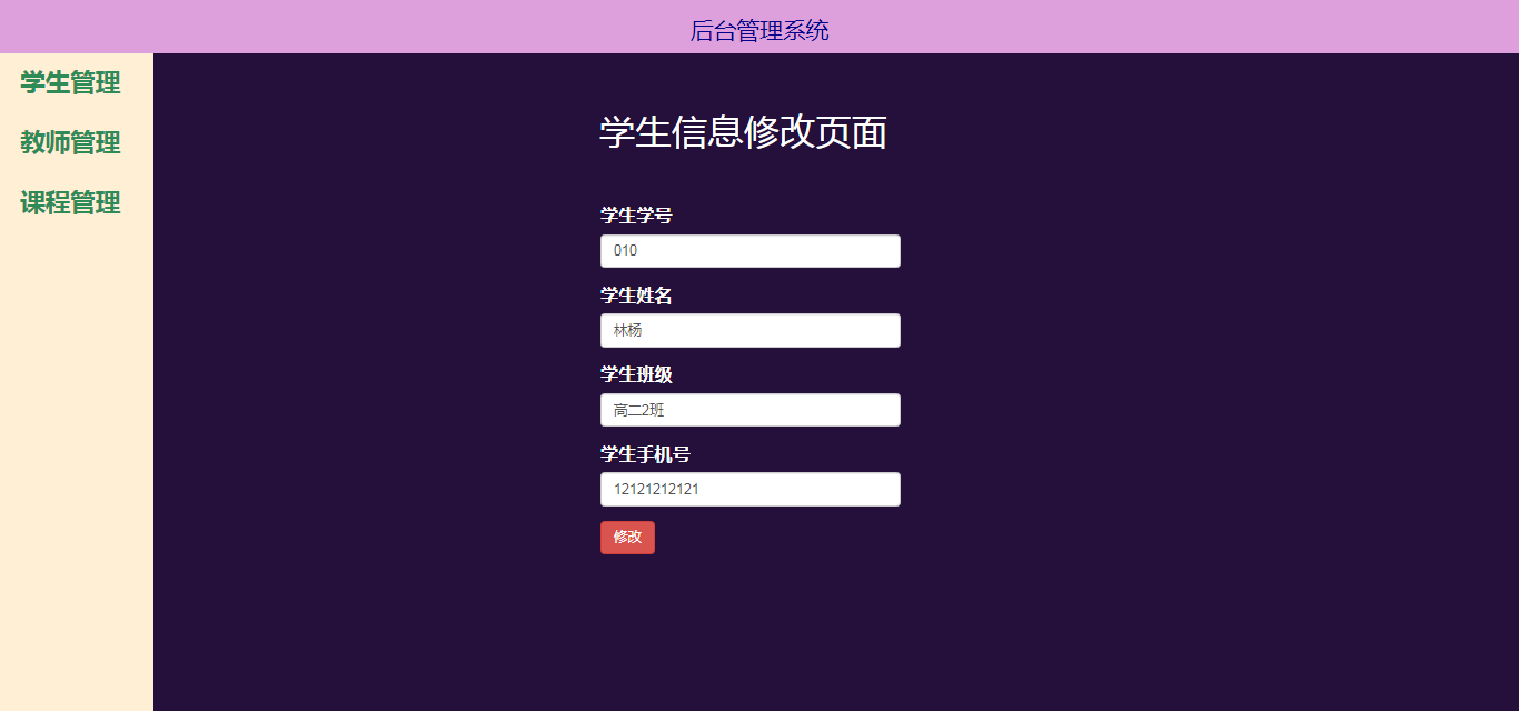 (1)修改的主要逻辑为设置动态路由,在/index/student的编辑按钮中设置点击事件+携带参数并进行页面跳转,在"/student/alter/参数"获取到参数,拿到localStorage对应下标的对象,赋值给input,实现当前页面渲染;点击修改按钮,进行替换;