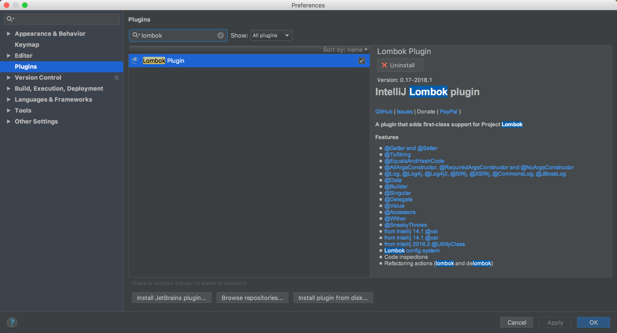 一个更直接的体现就是,普通的包在引用之后一般的 IDE 都能够自动识别语法,但是 Lombok 的这些注解,一般的 IDE 都无法自动识别,因此如果要使用 Lombok 的话还需要配合安装相应的插件来支持 IDE 的编译,防止IDE 的自动检查报错,下面以 IntelliJ IDEA 举例安装插件。