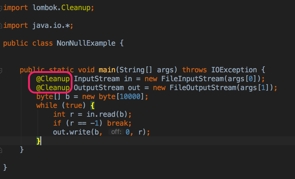 当我们对流进行操作,我们通常需要调用 close 方法来关闭或结束某资源,而 @Cleanup 注解可以帮助我们调用 close 方法,并且放到 try/finally 处理块中,如下图: