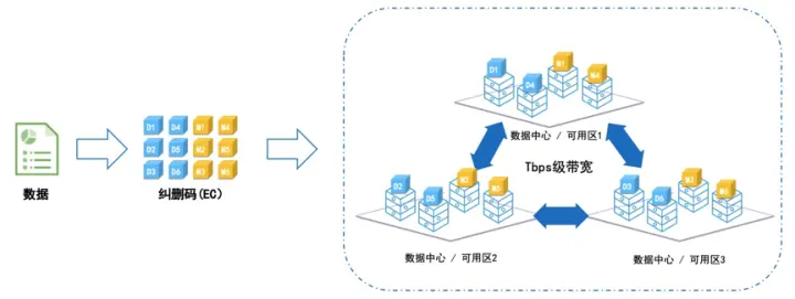 对于关键业务数据的同城高可用的要求,阿里云通过OSS同城冗余存储将冗余数据分布于同城的多个可用区上,其采用的是跨可用区分布式纠删码技术。传统的纠删码技术,通常是部署于同一集群,可以应对主机级的故障。而OSS同城冗余存储采用6+6的纠删码,将12个数据块冗余打散分布于3个可用区上,每个可用区存在四个数据块,6+6的纠删码机制最大可以允许损坏或丢失6个数据块。即便是某个可用区(或机房)遇到极端情况导致整个可用区不可服务时,只会影响4个数据块,不会影响业务的连续性和数据的可靠性。整个过程整个故障切换过程用户无感知、业务不中断、数据不丢失。