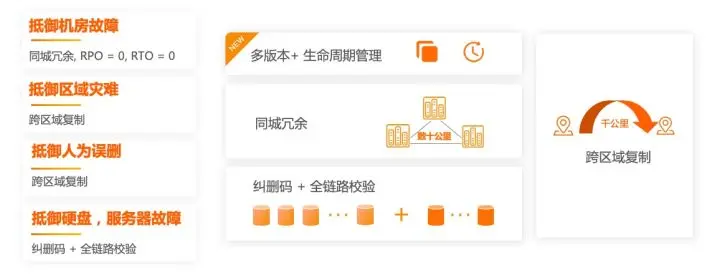 阿里云OSS基于业界领先的分布式存储系统构建强健的底座,在设计时充分考虑了存储介质失效、故障的可能性,采用碎片化分布式离散存储技术存储用户的数据,每一份在云端的数据都会被分块,每个分块文件会存多副本,分布于不同机架上,不同交换机下的服务器上,并引入分钟级别的自动维护机制。当某块硬盘发生异常时,对象存储系统将根据风险均衡策略,自动选择合适的硬盘重建数据,从而有效保证对象存储系统级的数据安全。某个服务器,甚至整个机柜出现故障,数据均不会丢失。