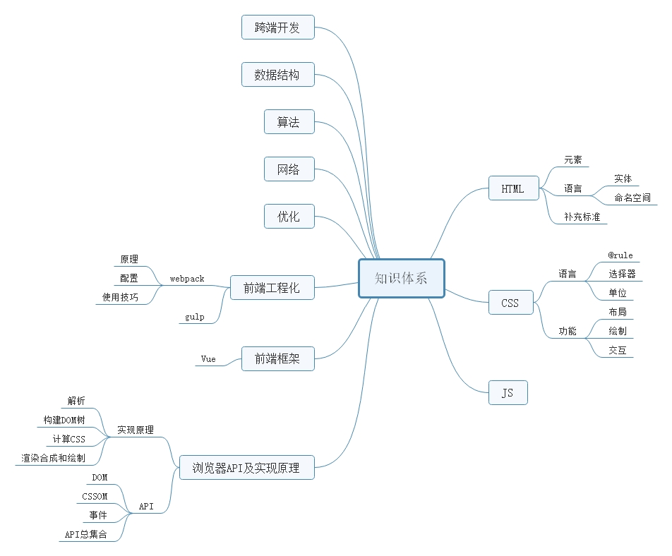 所以换一个角度,我们在编程学习的过程中建立自己的结构体系,遇到的各种问题都是在填补我们这个结构体系中的知识盲点。或者在我们的知识体系中去主动扩充我们的知识,填补知识盲点,而且学习的时候也能够做到触类旁通。以我现在的理解,我们要做的是前端的工程师,架构师。不只是能够去完成业务的代码,而是能够以业务的出发点去思考,这个业务用哪种技术做比较好。所以这就是我要列一份我自己前端结构体系的原因。