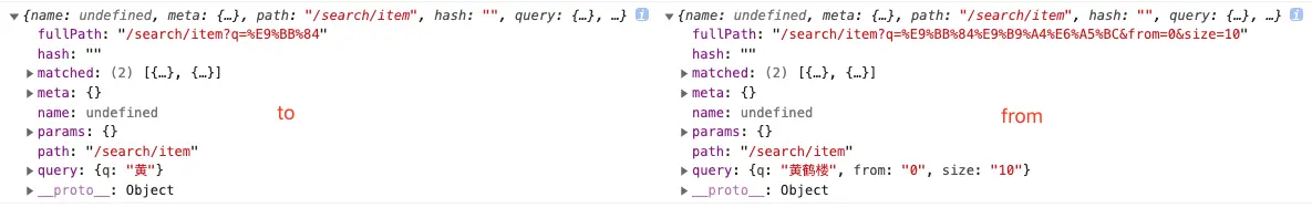 通过这种方式,URL中的任何变化,包括检索词、翻页等都能够监听到变化,其中to跟from的格式如下: