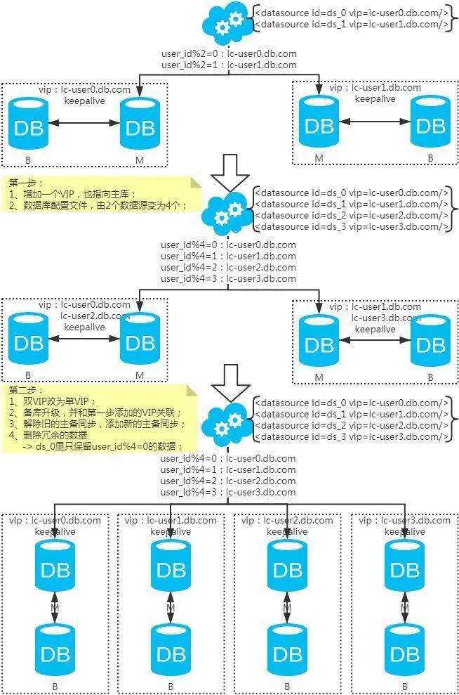 第一步:(同步双写)应用配置双写,部署;第二步:(同步双写)将老库中的老数据复制到新库中;第三步:(同步双写)以老库为准校对新库中的老数据;第四步:(同步双写)应用去掉双写,部署;