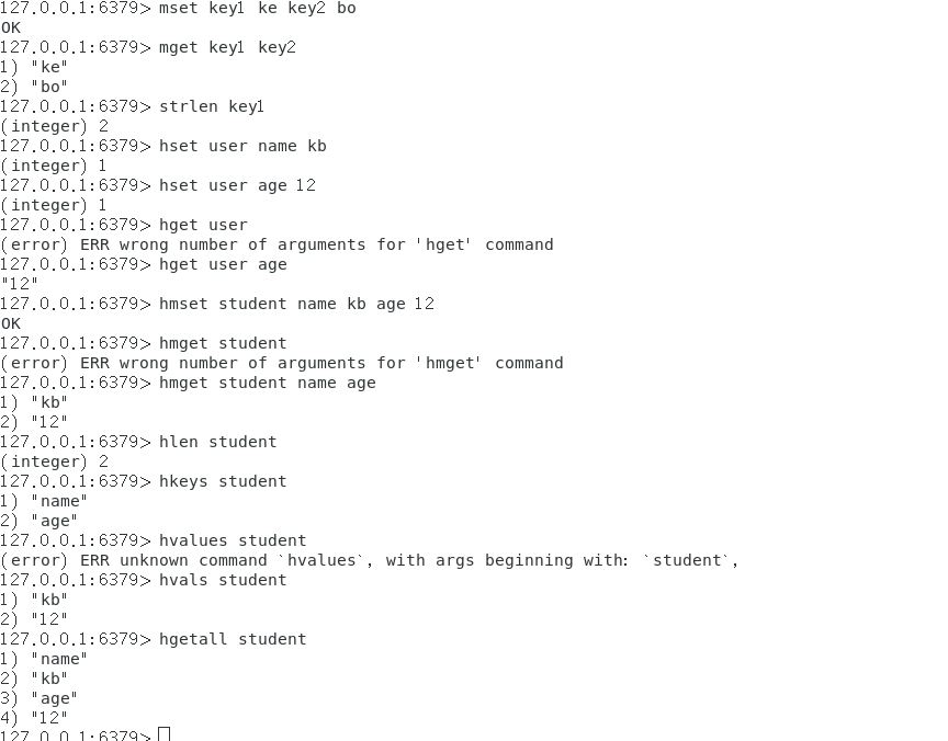 批量新增hmset <key> <field1> <value1> <field2> <value2> hmset student name kb age 12