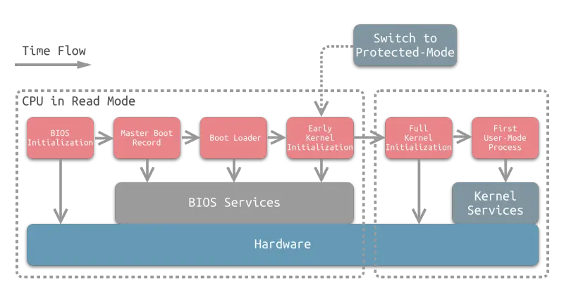 2000 年以前的计算机主板上均使用 BIOS,如今绝大多数计算机采用的是 EFI(Mac 用的就是 EFI)或 UEFI,BIOS 正在逐步被淘汰。基于 EFI、UEFI 的开机过程与传统的BIOS不尽相同,本文将以传统的 BIOS,Intel CPU 为例介绍开机过程。