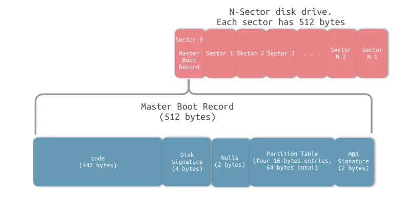 假设在硬盘上找到了操作系统,它会首先读取硬盘上的大小为 512 Bytes 的 0号扇区,这个扇区被称为 主引导记录(master boot record,MBR),其包含三部分: