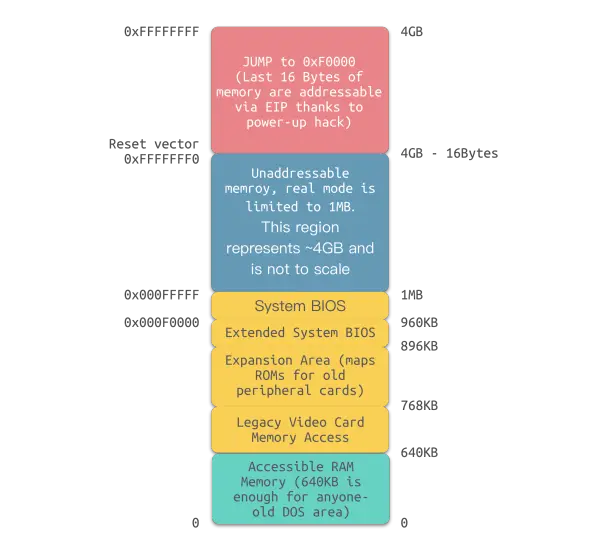 CPU 启动后其大多数寄存器会被初始化为预定的值,包括指令寄存器(instruction pointer, EIP),它保存着 CPU 将要执行指令的内存地址。此时 CPU 会有一个特殊行为,其会对 EIP 的初始值加上一个基址寄存器的值,生成一个 32 位的地址 0xFFFFFFF0。之所以称为特殊行为,是因为实模式下 CPU 只能寻址 1MB 地址空间,而这个 32 位地址已经大于 1MB 的内存限制。因此,0xFFFFFFF0 也被称为重置向量(reset vector),参考上图 0xFFFFFFF0 处的标识。