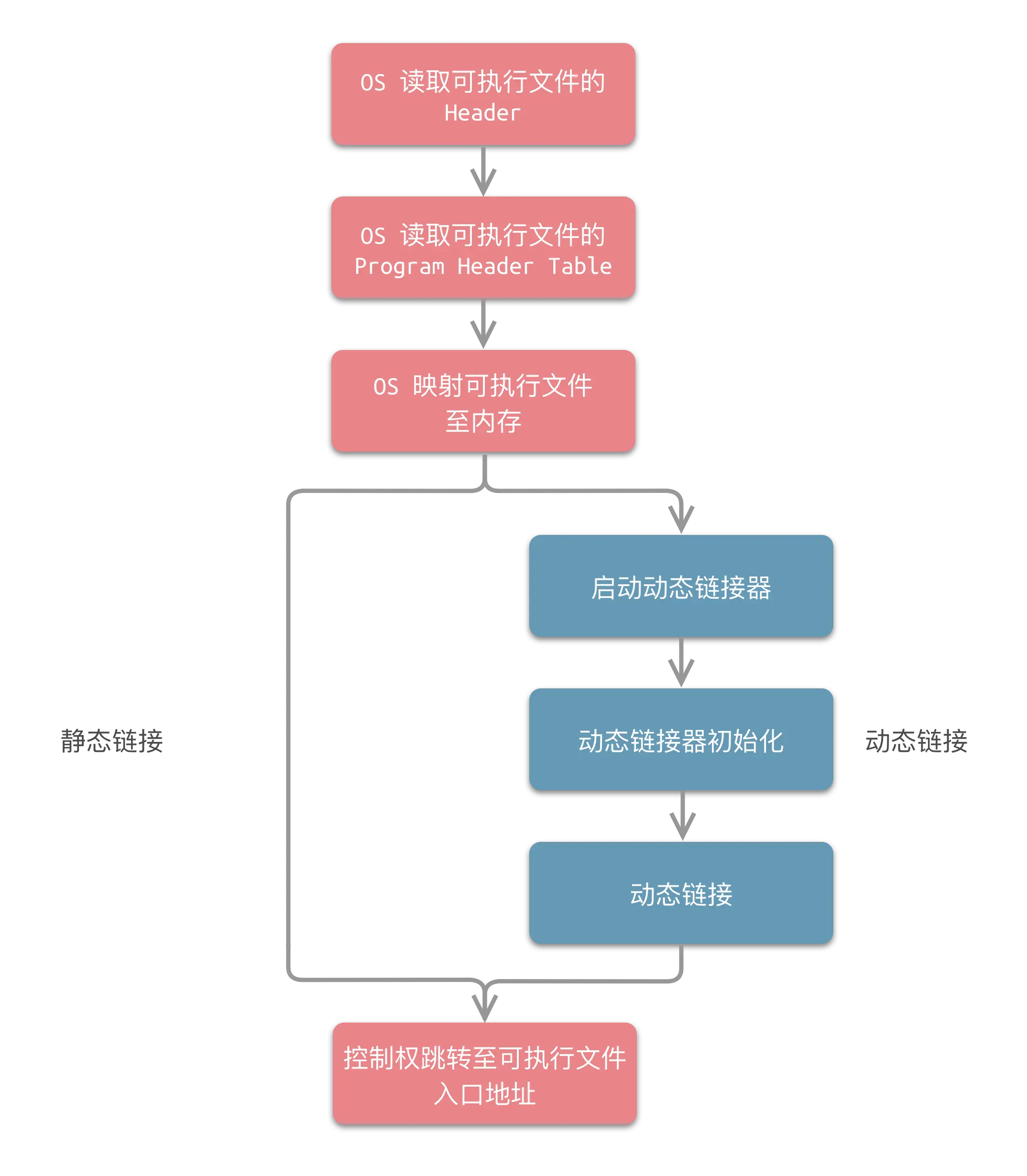 Program Header Table将可执行文件 ELF 映射至内存。 - 如果是静态链接的情况,则直接跳转至第 7 步;如果是动态链接的情况,操作系统将查找