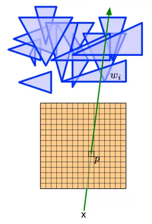 关于光栅化的概念,以下图为例,假如有一道绿光与存储在内存中的一堆三角形中的某一个在三维空间坐标中存在相交的关系。那么这些处于相交位置的像素都会被绘制到屏幕上。当然这些三角形在三维空间中的前后关系也会以遮挡或部分遮挡的形式在屏幕上呈现出来。一句话总结:光栅化就是将数据转化成可见像素的过程。