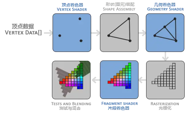 第六阶段,测试与混合。该阶段会检测片段的对应的深度值(z 坐标),判断这个像素位于其它物体的前面还是后面,决定是否应该丢弃。此外,该阶段还会检查 alpha 值( alpha 值定义了一个物体的透明度),从而对物体进行混合。因此,即使在片段着色器中计算出来了一个像素输出的颜色,在渲染多个三角形的时候最后的像素颜色也可能完全不同。