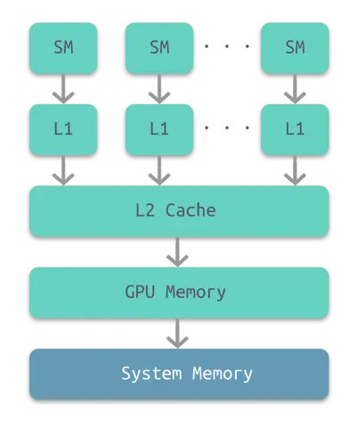 下图所示为 GPU 内部的层级结构。最底层是计算机的系统内存,其次是 GPU 的内部存储,然后依次是两级 cache:L2 和 L1,每个 L1 cache 连接至一个 流处理器(SM,stream processor)。