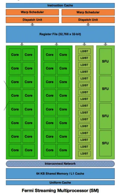 下图所示为 GPU 中每个流处理器的内部结构示意图。每个流处理器集成了一个 L1 Cache。顶部是处理器核共享的寄存器堆。