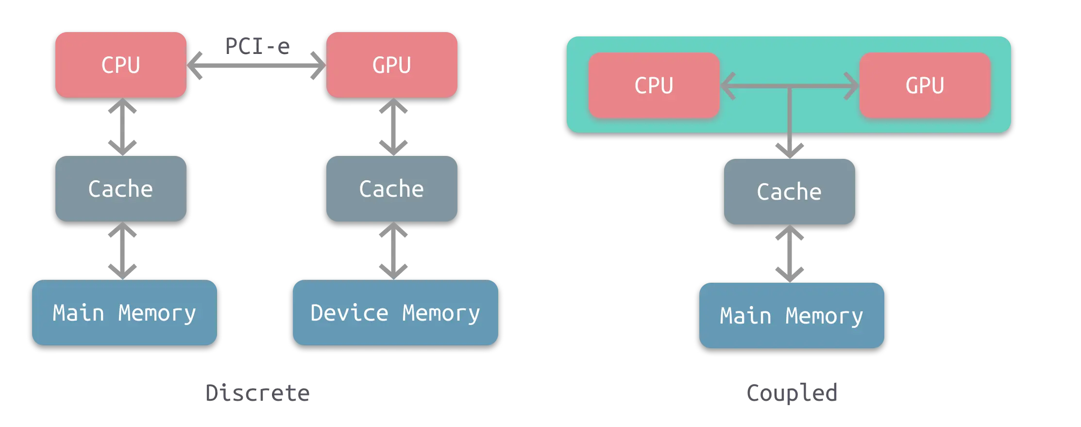 左图是分离式的结构,CPU 和 GPU 拥有各自的存储系统,两者通过 PCI-e 总线进行连接。这种结构的缺点在于 PCI-e 相对于两者具有低带宽和高延迟,数据的传输成了其中的性能瓶颈。目前使用非常广泛,如PC、智能手机等。