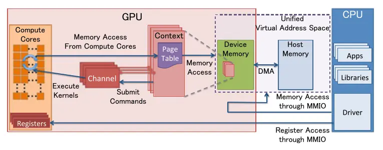 - GPU 页表与 CPU 页表分离,其驻留在 GPU 内存中,物理地址位于 GPU 通道描述符中。 通过 GPU channel 提交的所有命令和程序都在对应的 GPU 虚拟地址空间中执行。