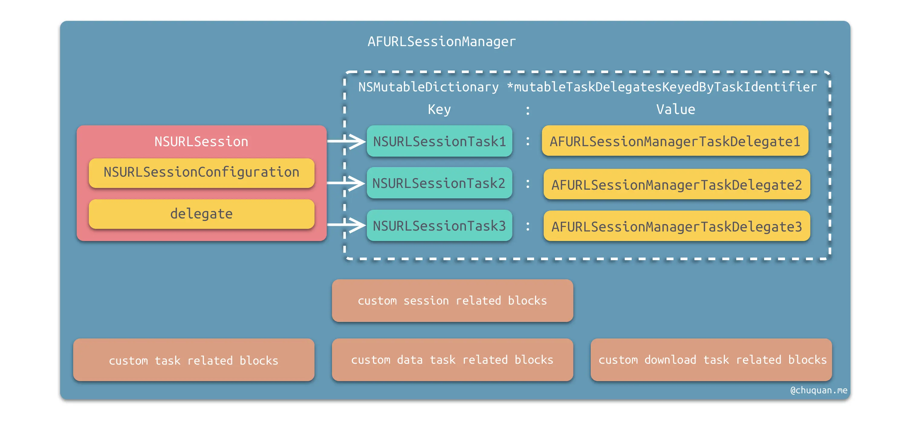 AFURLSessionManager主要用于管理会话,根据职责单一原则,它不应该管理任务对象的具体细节。
