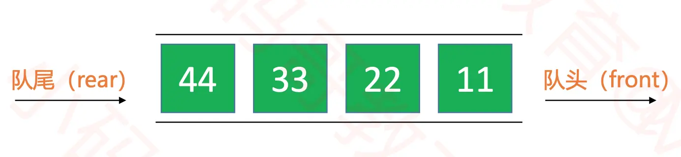 队尾(rear): 只能从队尾添加元素, 一般叫做enQueue, 入队