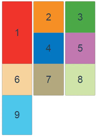 我们对Grid布局中的第一项添加了grid-row-start:1和grid-row-end:span 2,令其上边框位于1水平网格线,下边框距上边框跨越2个水平网格线。从效果上看来,是不是有点像瀑布流了呢!
