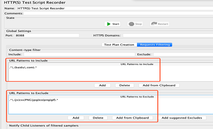 我们可以利用正则表达式排除一些静态资源在http(s) Test Script Recoder下找到Requests Filtering 添加“include”与 “Exclude”URL 正则匹配表达式