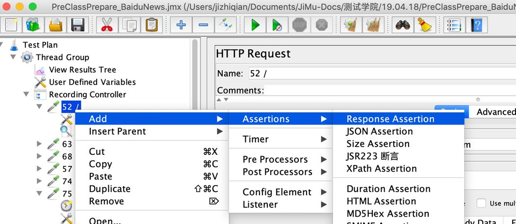 右键单击对应的 HTTP Request,添加 Response Assertion