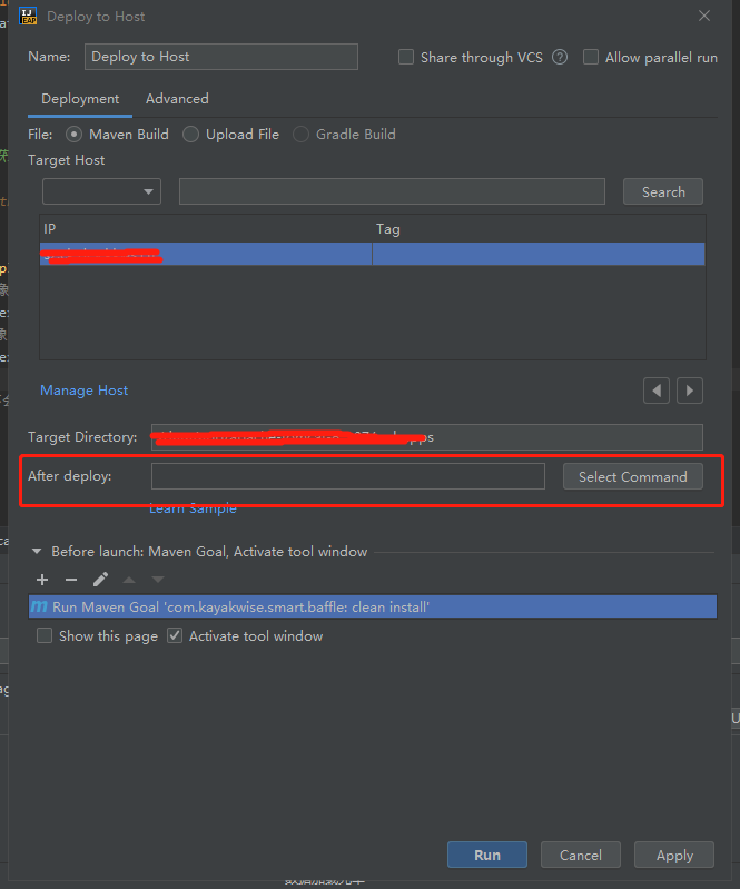 以上是 Cloud Toolkit 插件默认的部署窗口,在上面的配置窗口中,我们注意到有一个 Before launch 的模块,这个模块是用来添加运行前的任务的,比如执行 Maven 打包任务